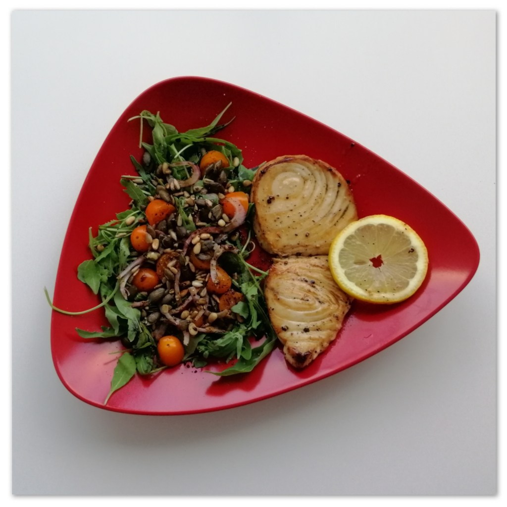 frisch gemahlenem schwarzen Pfeffer würzen und mit der Zitronenscheibe zum Salat auf den Teller geben