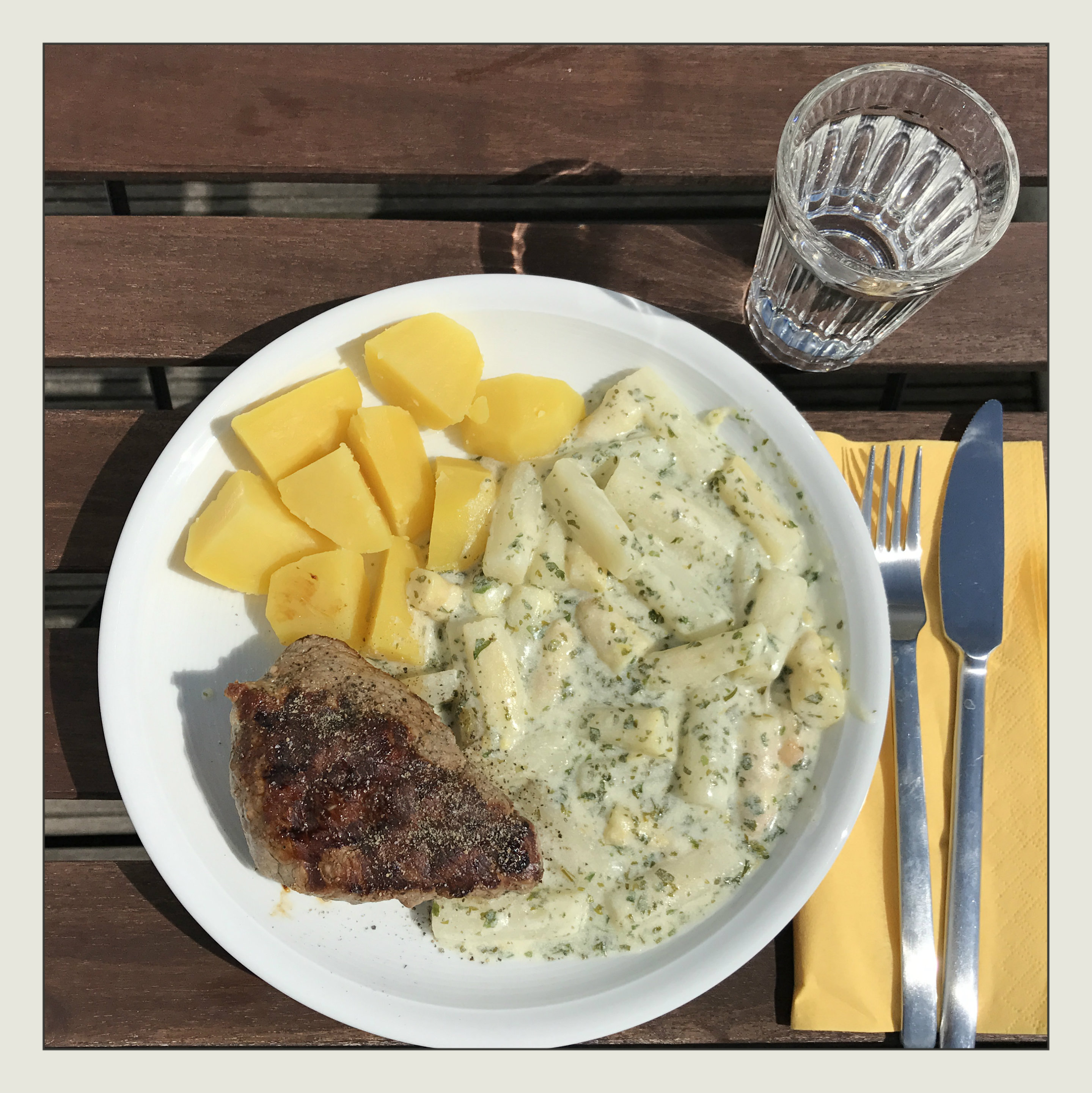 frisch gemahlenem schwarzen Pfeffer würzen und mit Kartoffeln und Spargel auf einem vorgewärmten Teller servieren
