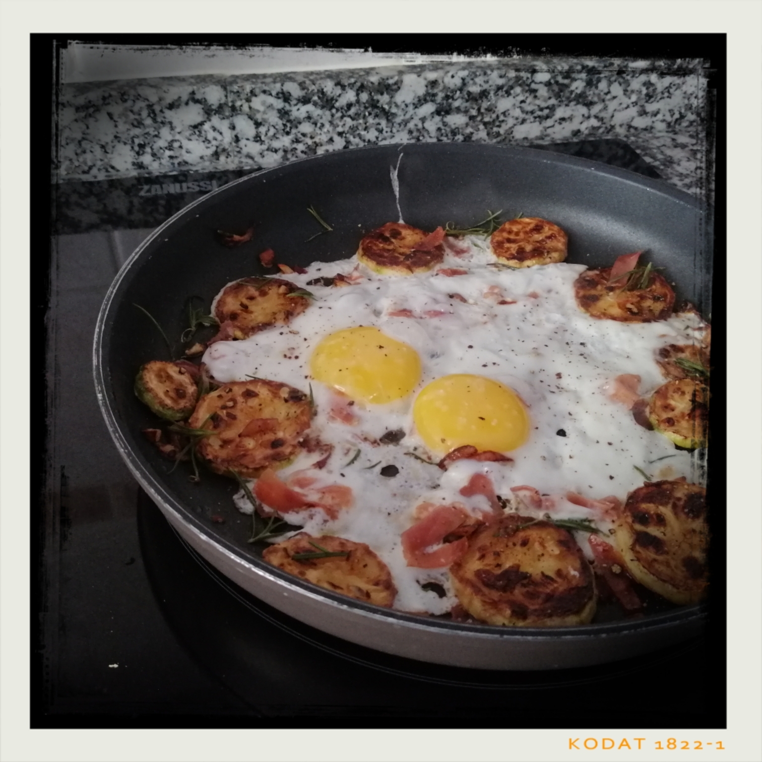 frisch gemahlenem schwarzen Pfeffer würzen und den Schinken untermischen, anschließend die Zucchini-Scheiben (mit einem Teil des Schinkens) an den Rand der Pfanne schieben,