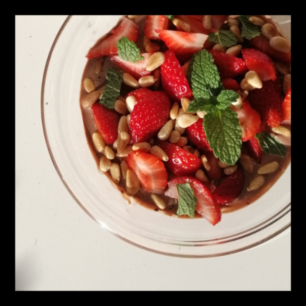 125 g Erdbeeren vierteln und auf den Joghurt geben, dann mit den Pinienkernen bestreuen und mit den Minzblättchen dekorieren