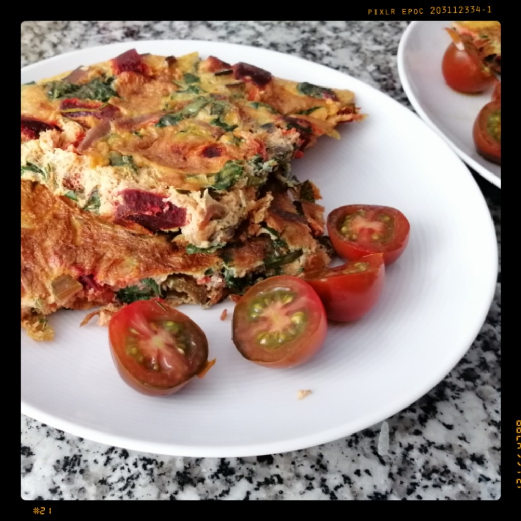 die Tortilla vierteln (oder dritteln) und auf zwei bzw. drei vorgewärmten Tellern mit ein paar Baby-Kumato-Tomaten servieren