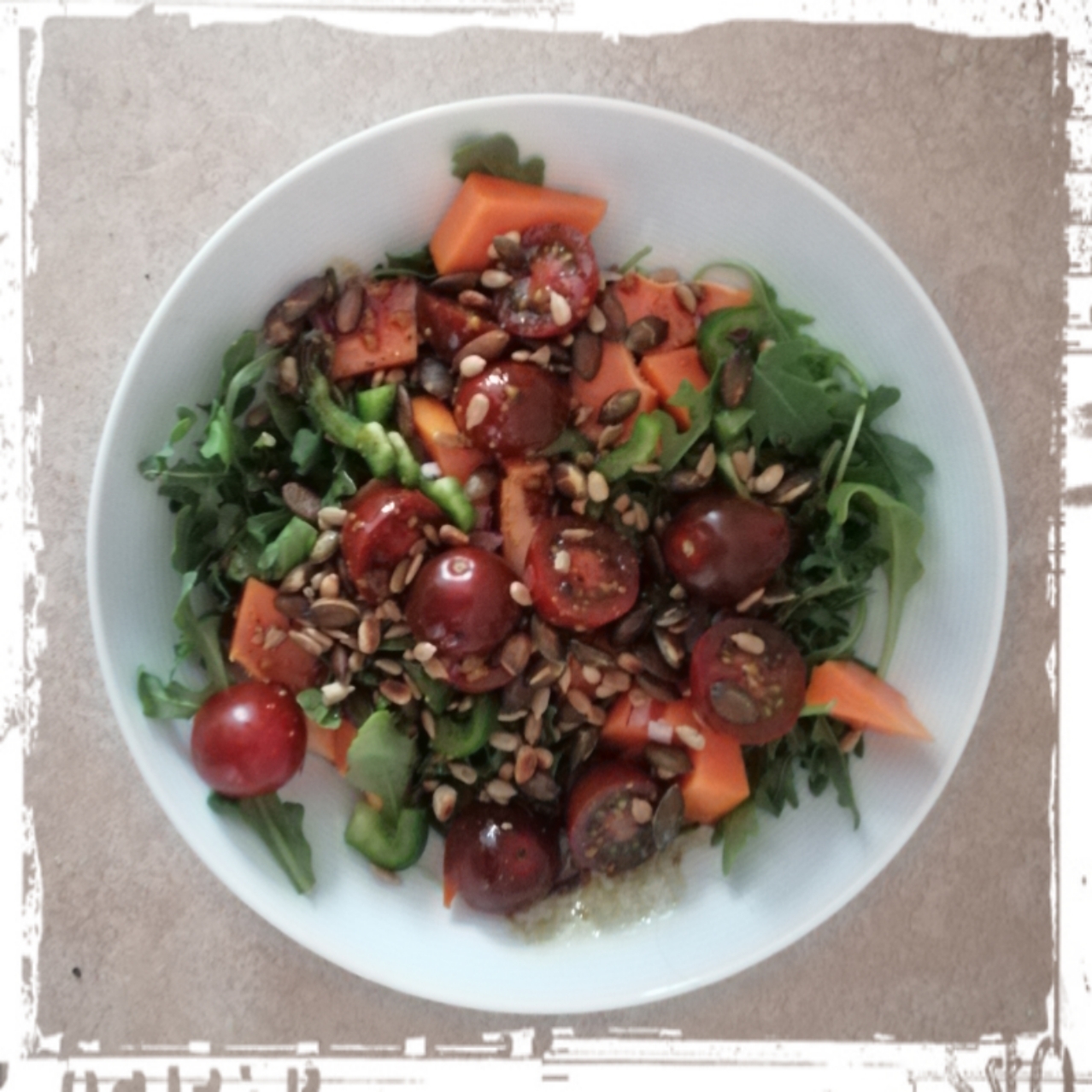 frisch gemahlenen schwarzen Pfeffer anmachen, dann die Salatkerne darüberstreuen