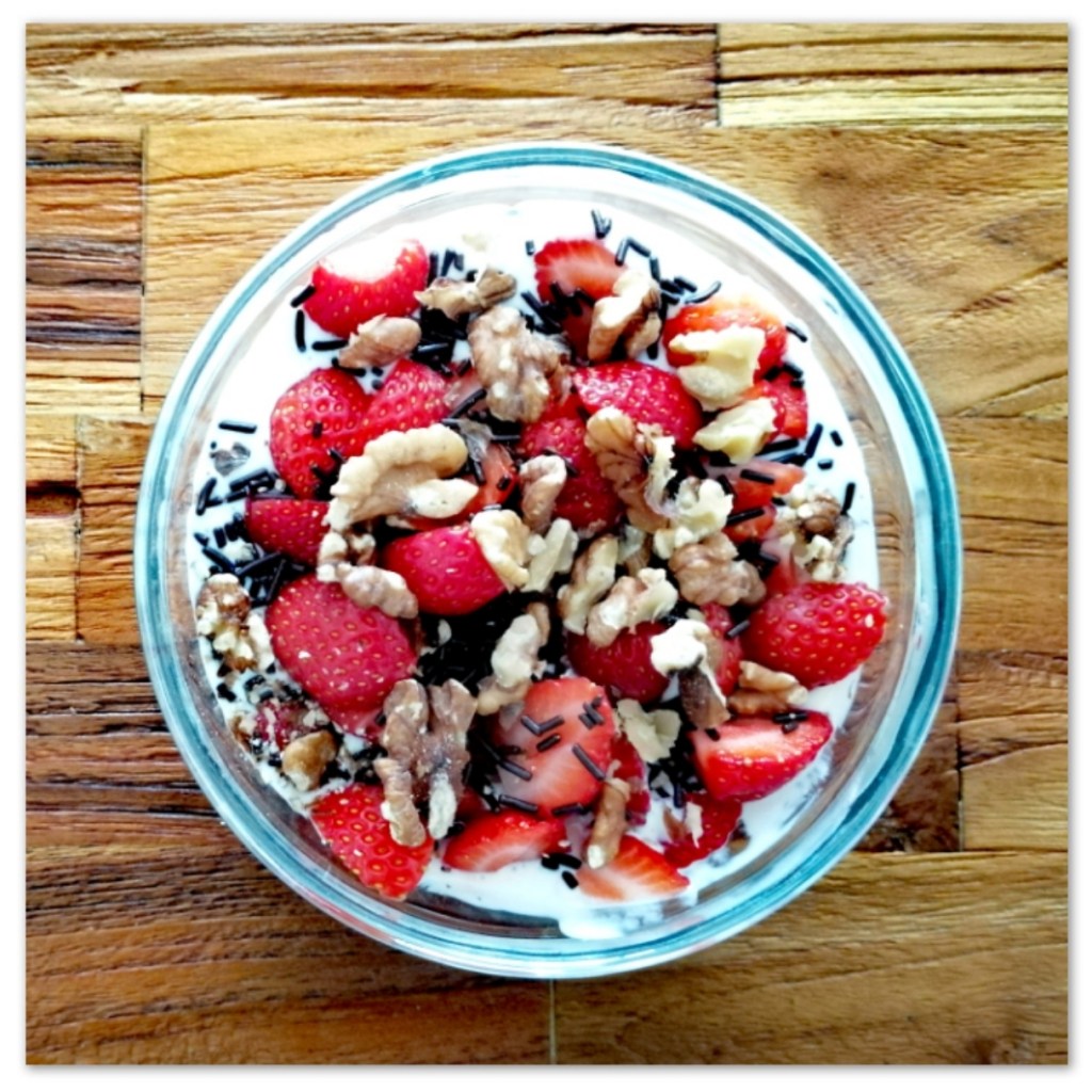 125 g Erdbeeren vierteln und auf den Joghurt geben, dann