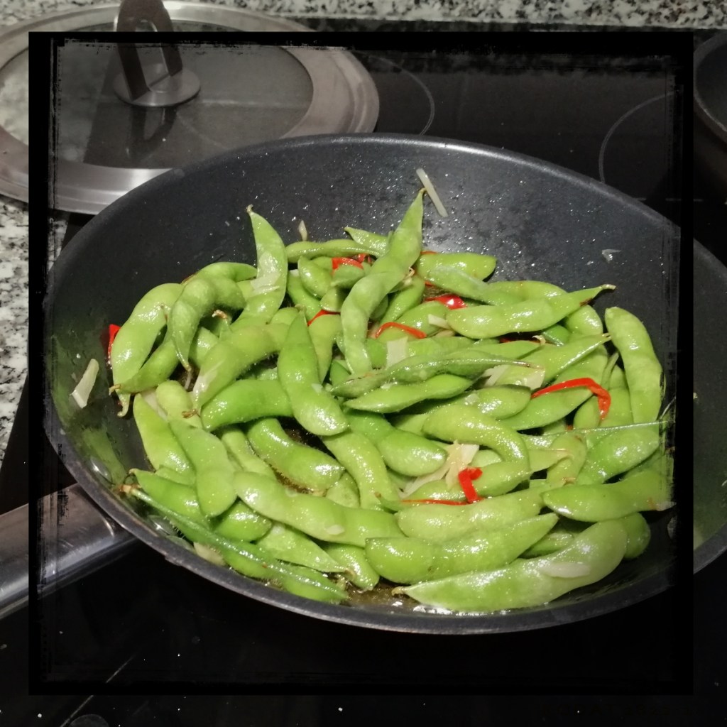 250 g TK Edamame (grüne Sojabohnen in Schale) mit dem Öl vermischen und unter dem Deckel bei mittlerer Hitze unter ab und zu umwenden garen, dann noch mit