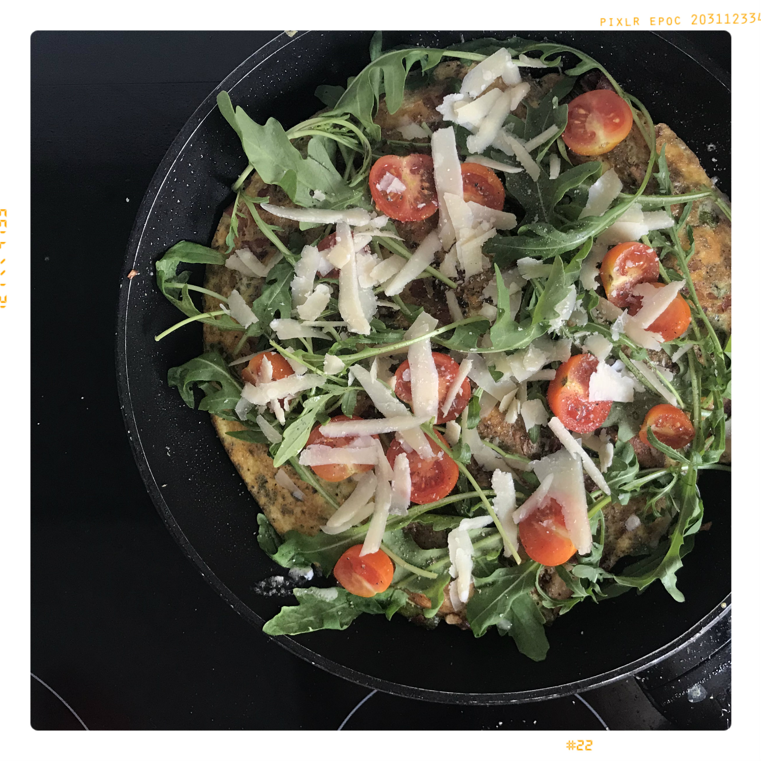 das Omelette über den Deckel wenden und noch weitere 2 Min. in der offenen Pfanne braten, in der Zeit Rucola und Tomaten darauf verteilen, alles noch mit