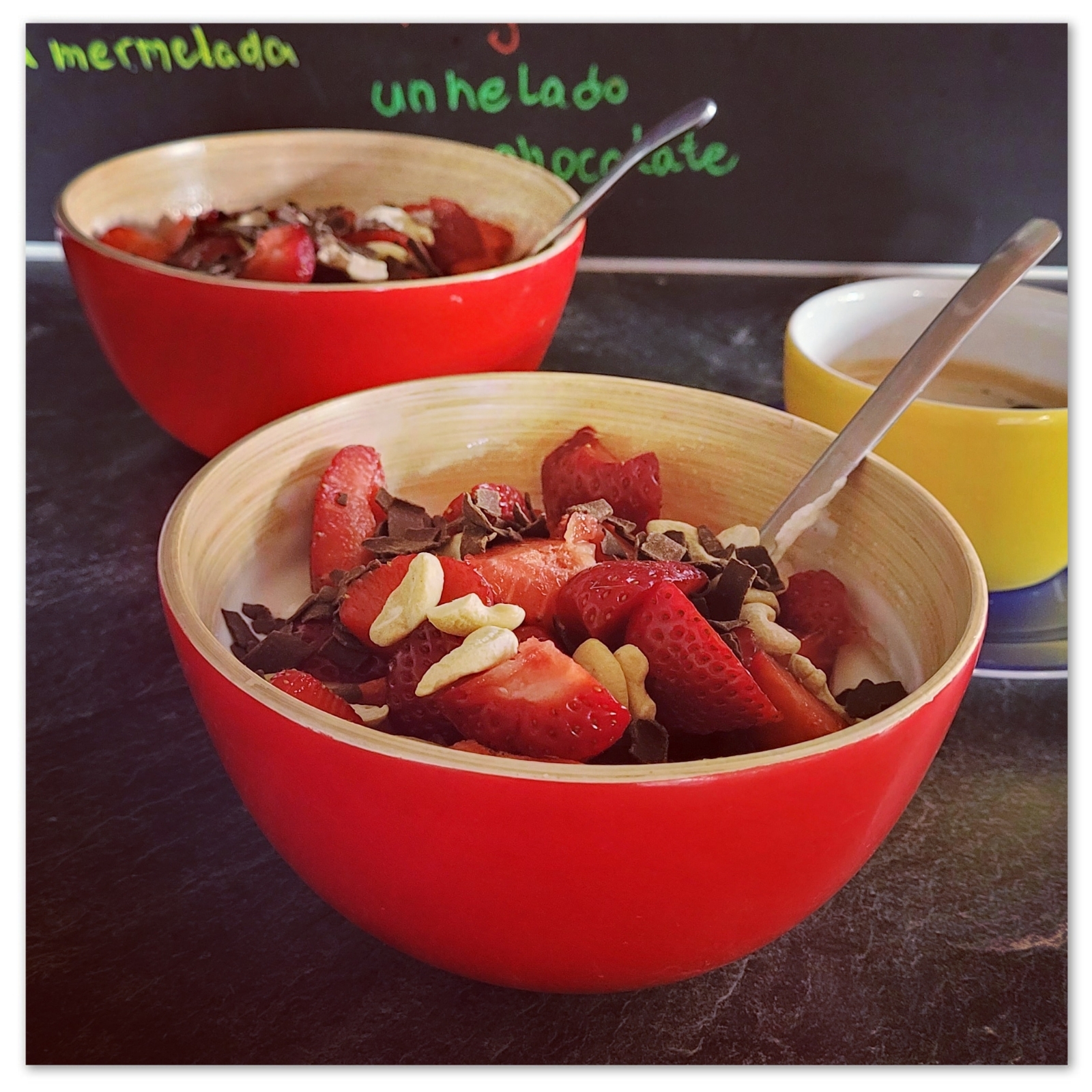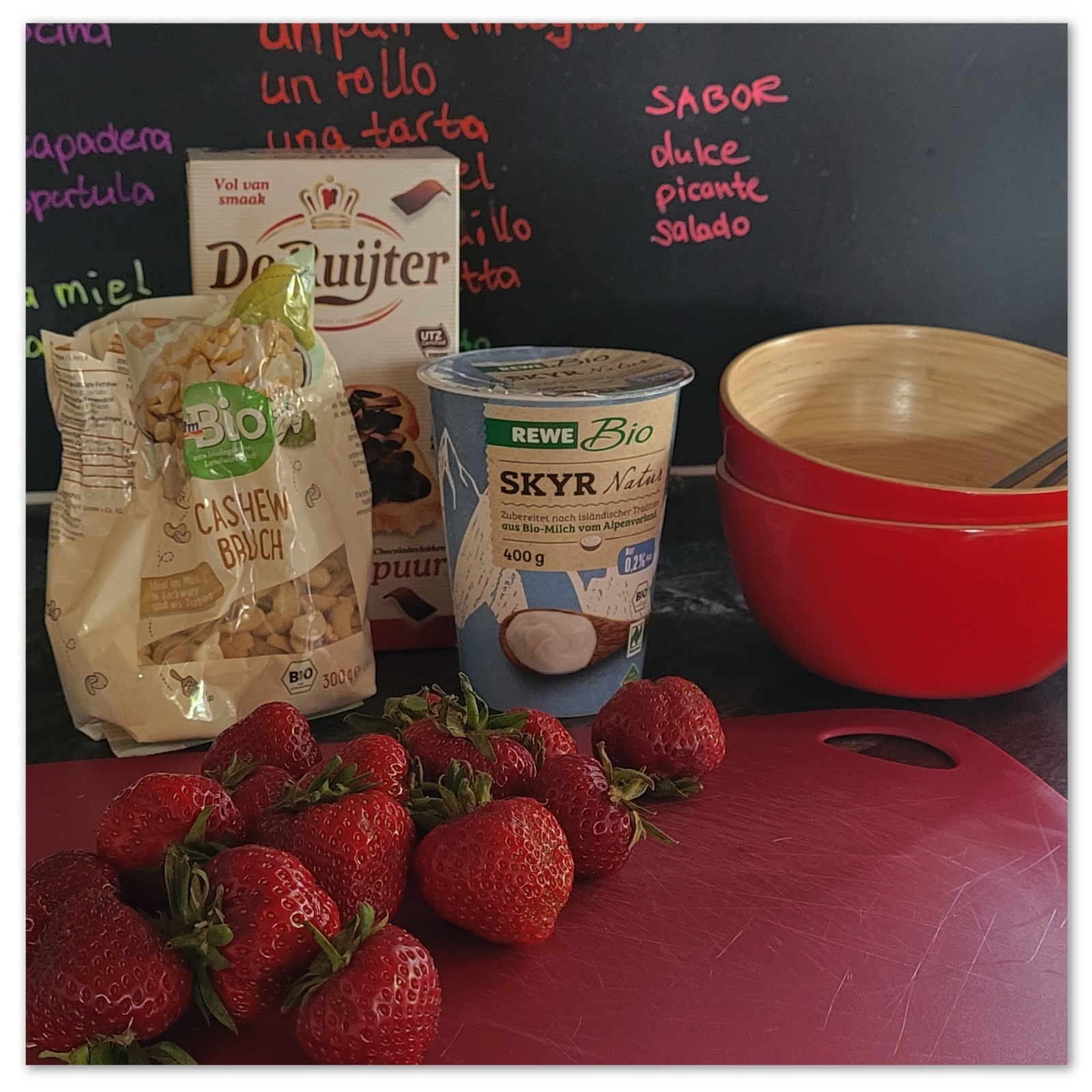 180 g Erdbeeren vierteln und auf den Skyr geben, dann mit