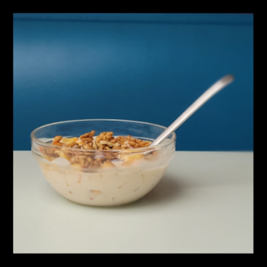 1 sehr kl. Banane (oder 1/2) in kleine Stücke schneiden, beides nicht ganz komplett unter den Joghurt mischen, dann