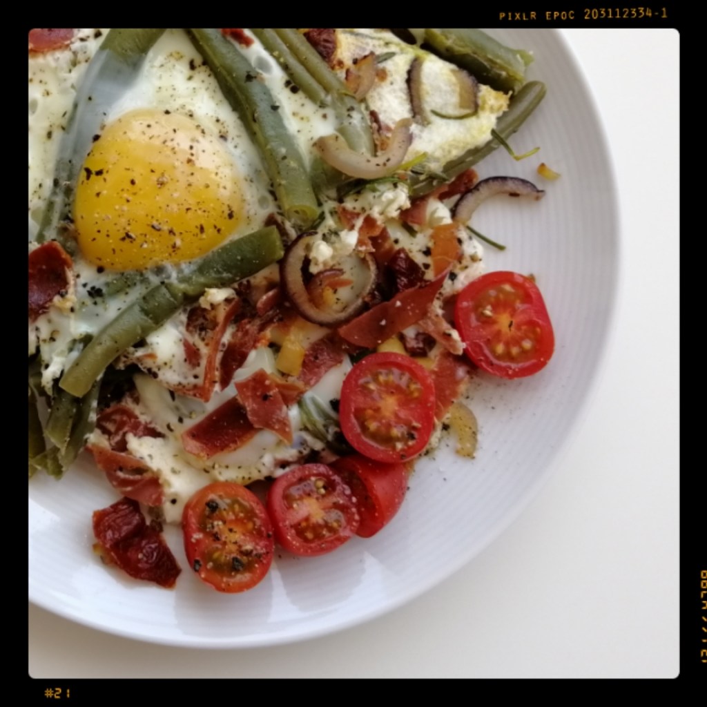 2 Eier (M) zwischen die Bohnenmischung geben, dann die Tomaten darauf verteilen, alles mit