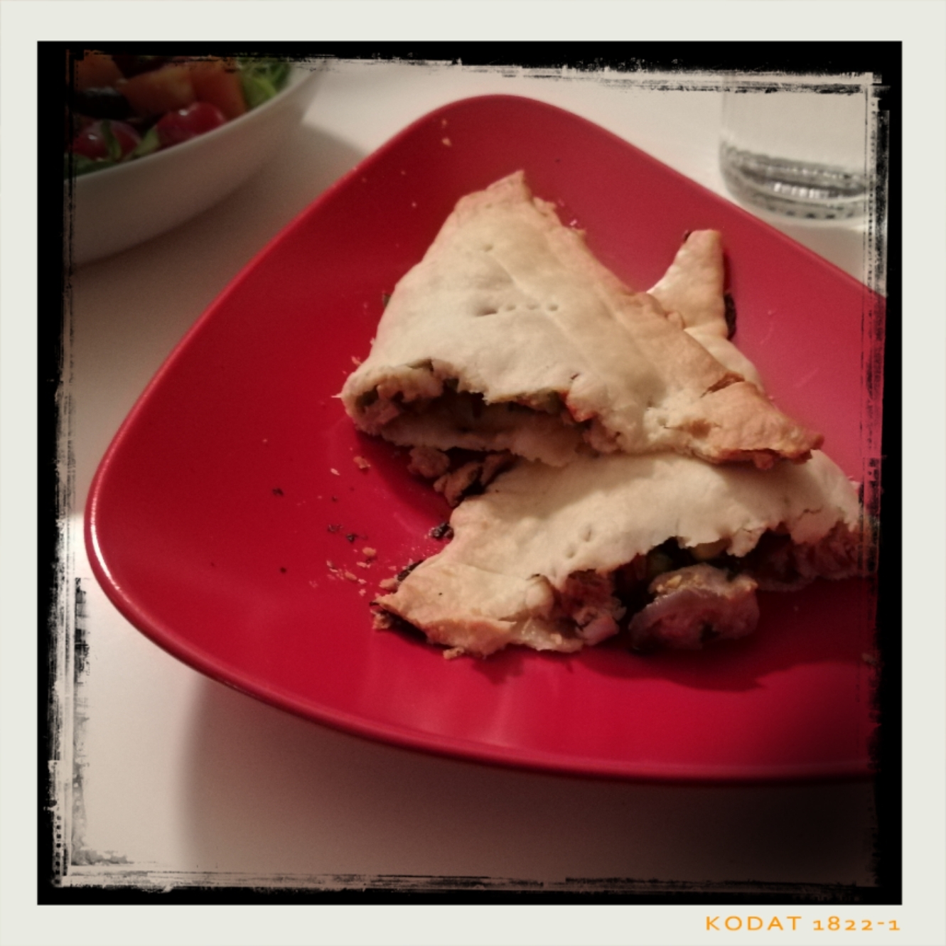 460 g Empanada-Teig (Fertigprodukt aus der Kühltheke) in 8 Quadrate teilen und die Tunfisch-Mischung darauf verteilen, die Ränder des Teigs mit Wasser befeuchten und die Quadrate zu Dreiecken zusammenklappen, die Ränder mit einer Gabel aneinanderdrücken, die Empanadas mit
