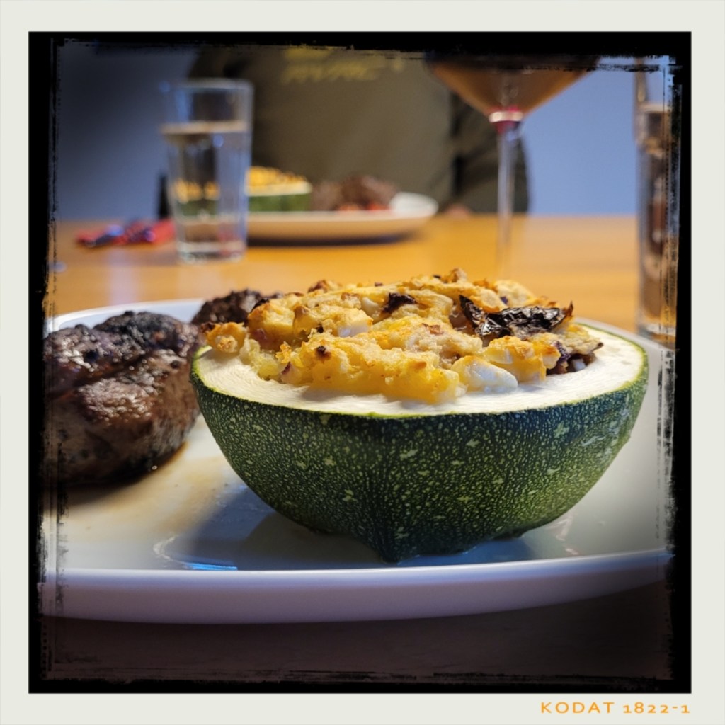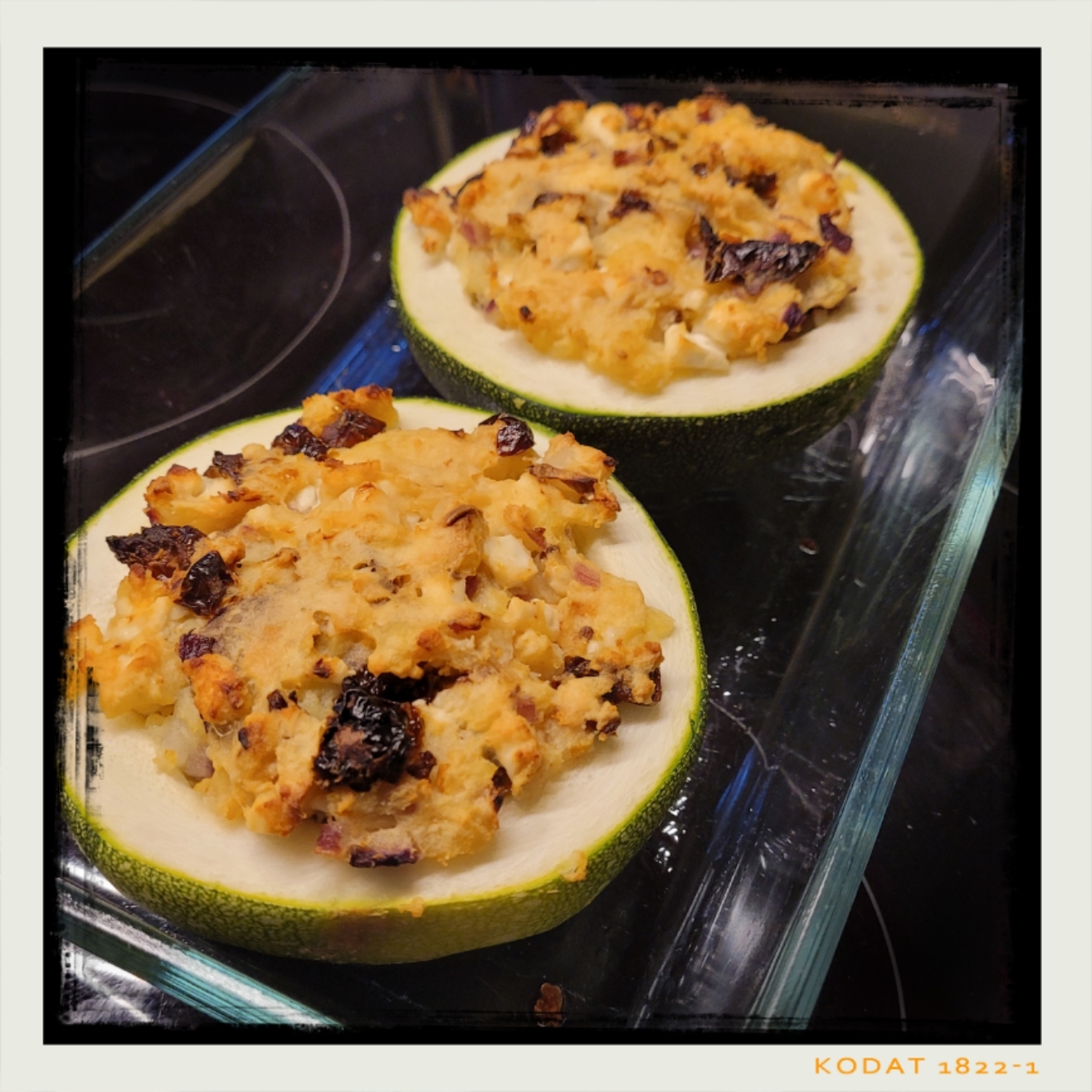 1 großen runde Zucchini (ca. 650 g) den Stiel und die Blüte so abschneiden, dass eine flache Fläche entsteht, dann quer halbieren, mit dem Löffel den Kernbereich herauslösen (und wegwerfen) und nebeneinander in die Auflaufform setzen,