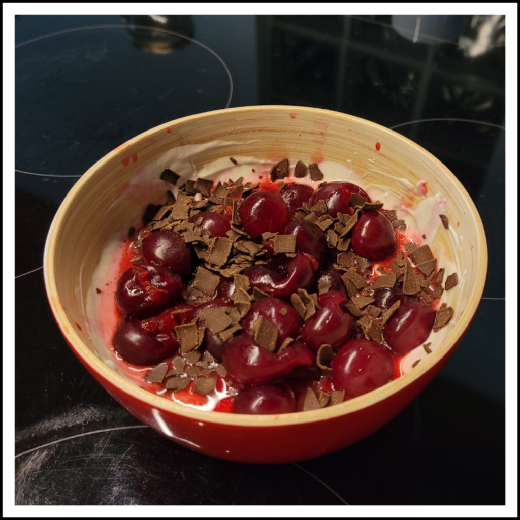 150 g Sauerkirschen entsteinen und daraufgeben, dann mit
