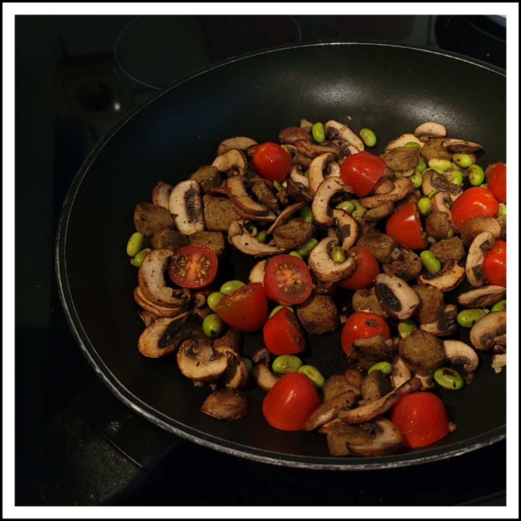 1 EL Brat-Olivenöl unter mehrfachem Wenden ca. 5 Min. braten, dann die Temperatur auf mittel reduzieren, die Lupinenbratwurst-Mischung hinzufügen und ca. 2 Min. mitbraten, anschließend die Tomaten hinzufügen, alles mit
