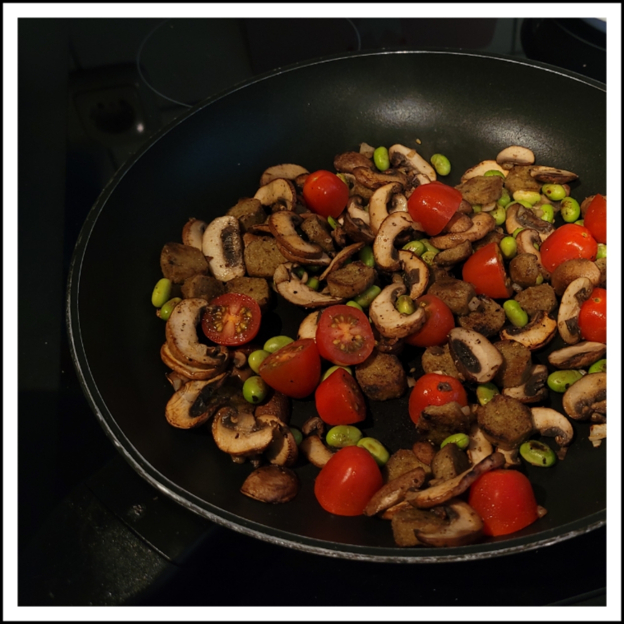 1 EL Brat-Olivenöl unter mehrfachem Wenden ca. 5 Min. braten, dann die Temperatur auf mittel reduzieren, die Lupinenbratwurst-Mischung hinzufügen und ca. 2 Min. mitbraten, anschließend die Tomaten hinzufügen, alles mit