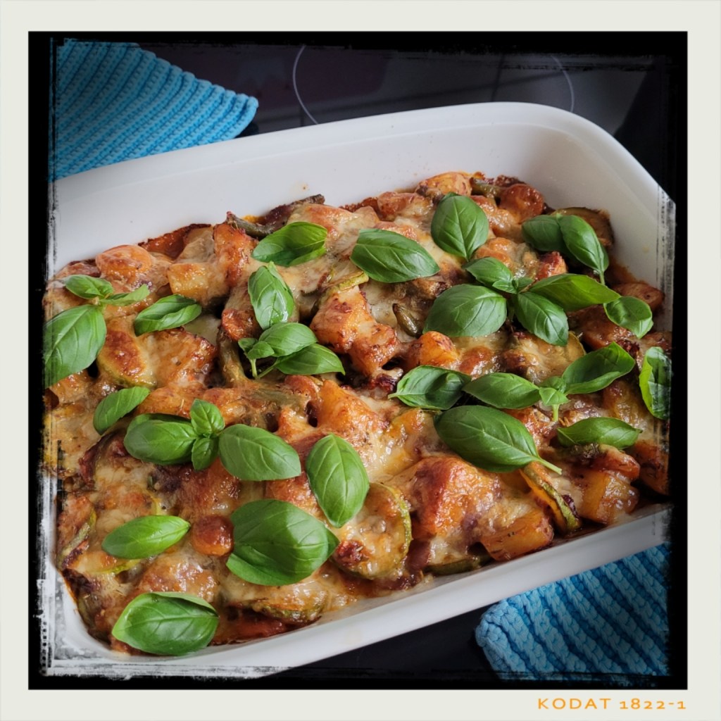 1 El Brat-Olivenöl einfetten, die Gemüsemischung hineinfüllen, mit den Mozzarella-Scheiben belegen und mit dem Emmentaler bestreuen, die Auflaufform auf mittlerer Einschubleiste in den Ofen geben und 20 Min. gratinieren