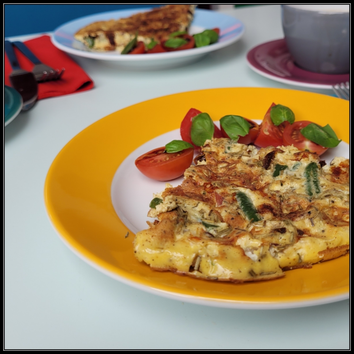 die Tortilla in vier oder eben sechs (Torten-)Stücke teilen und auf vorgewärmten Tellern z. B. mit Cocktailtomaten und Basilikum servieren
