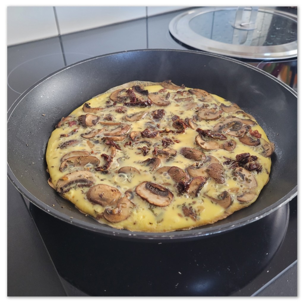 1 EL Brat-Olivenöl in die Pfanne geben und die Eimischung hineingeben, die Champignonmischung darauf verteilen, die Pfanne mit dem Deckel schließen und das Omelett bei mittlerer Hitze ca. 5 Min. braten, derweil