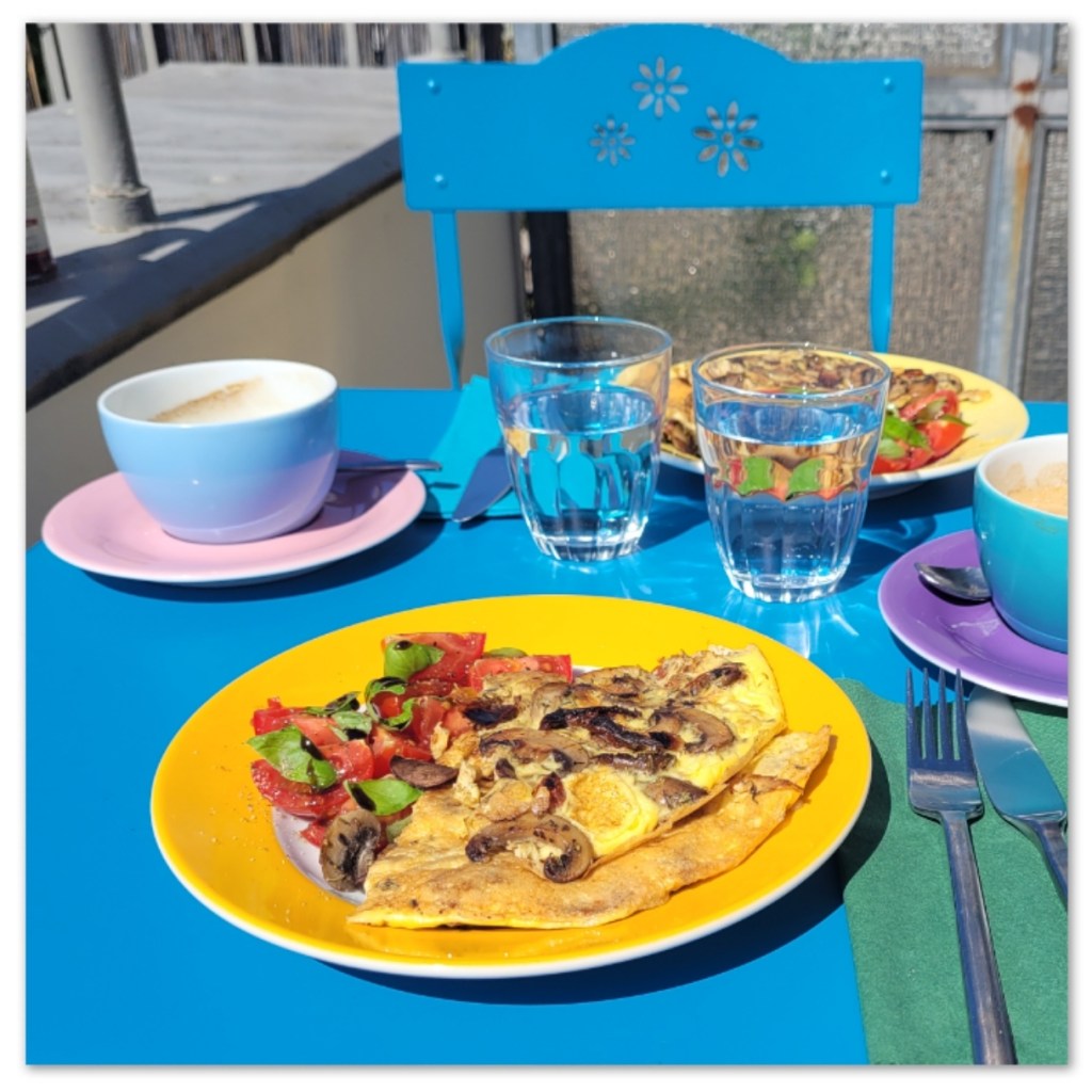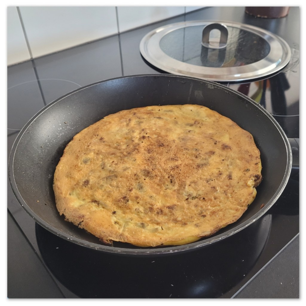 wenn das Ei gestockt ist, das Omelett über den Deckel wenden und noch ca. 2 min. braten, dann das Omelett vierteln und je zwei Stücke auf die Teller geben