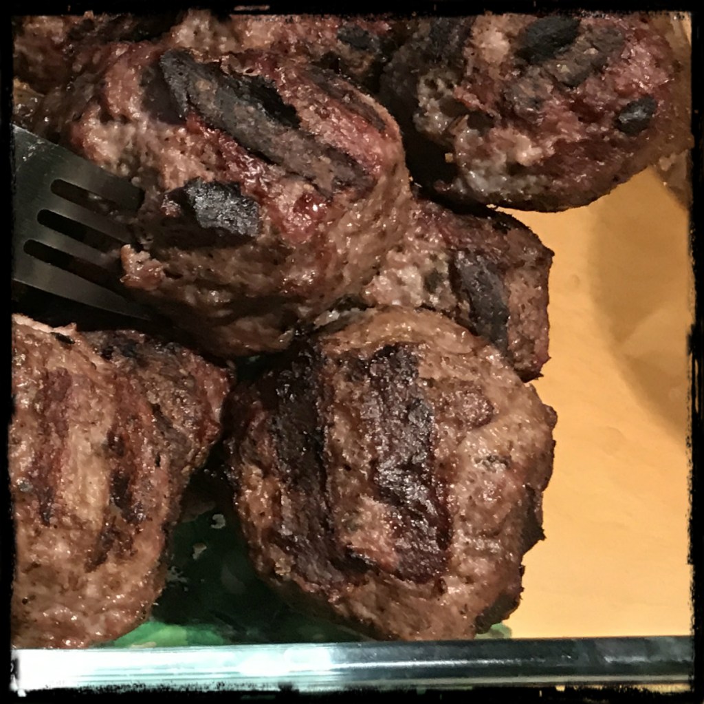 200 g griechischen Feta aus Schafs- und ggf. Ziegenmilch in 24 Würfel zerteilen, je 1/24 des Hackfleischteiges in der Handfläche flach drücken, einen Schafskäsewürfel hineingeben und zu einer Kugel formen, alle Hackbällchen auf dem Rost unter der Haube in ca. 15 Minuten unter häufigem Wenden rundum braun grillen, sie sollen aber auch nicht zu trocken werden, wie auch der Feta nicht ausbraten sollte