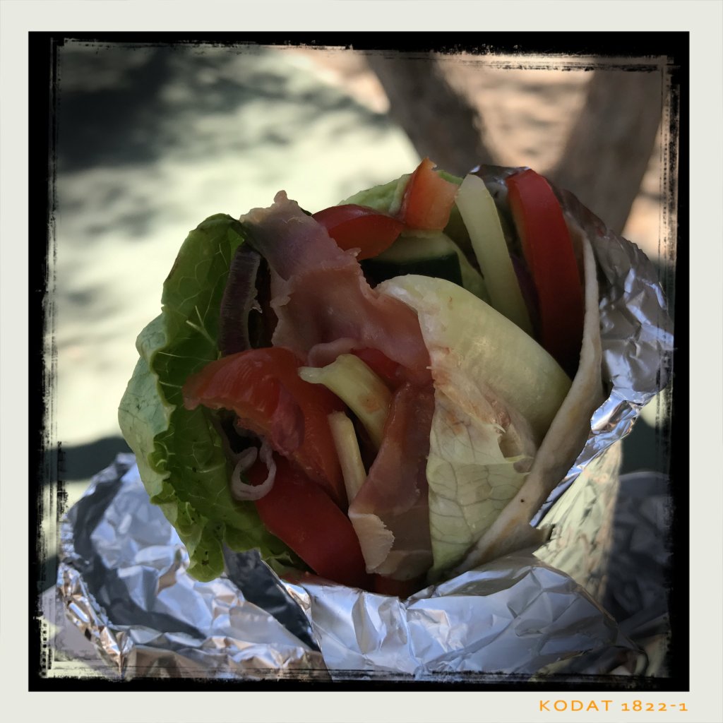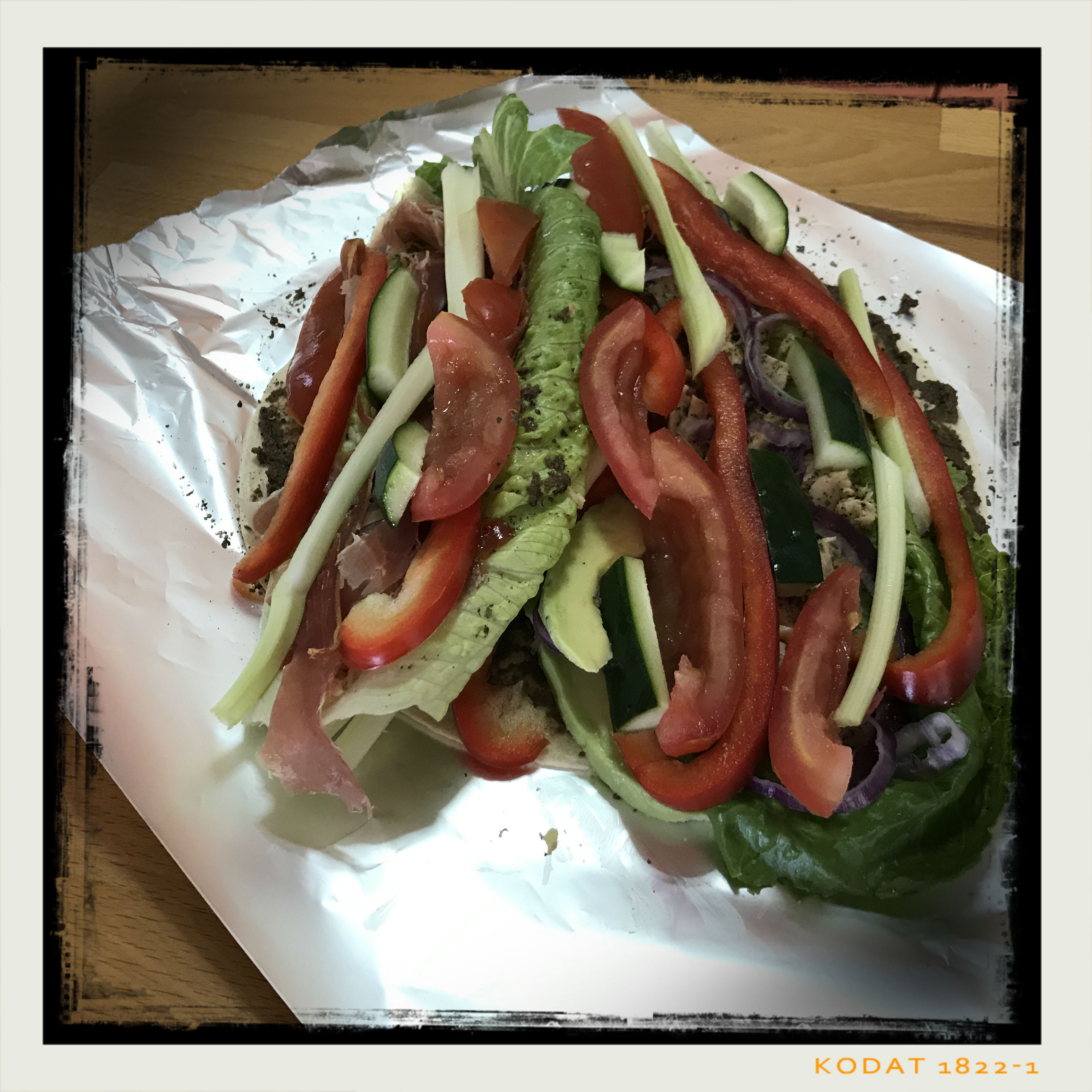 frisch gemahlenem schwarzen Pfeffer würzen, zu einem Wrap fest zusammenrollen und in