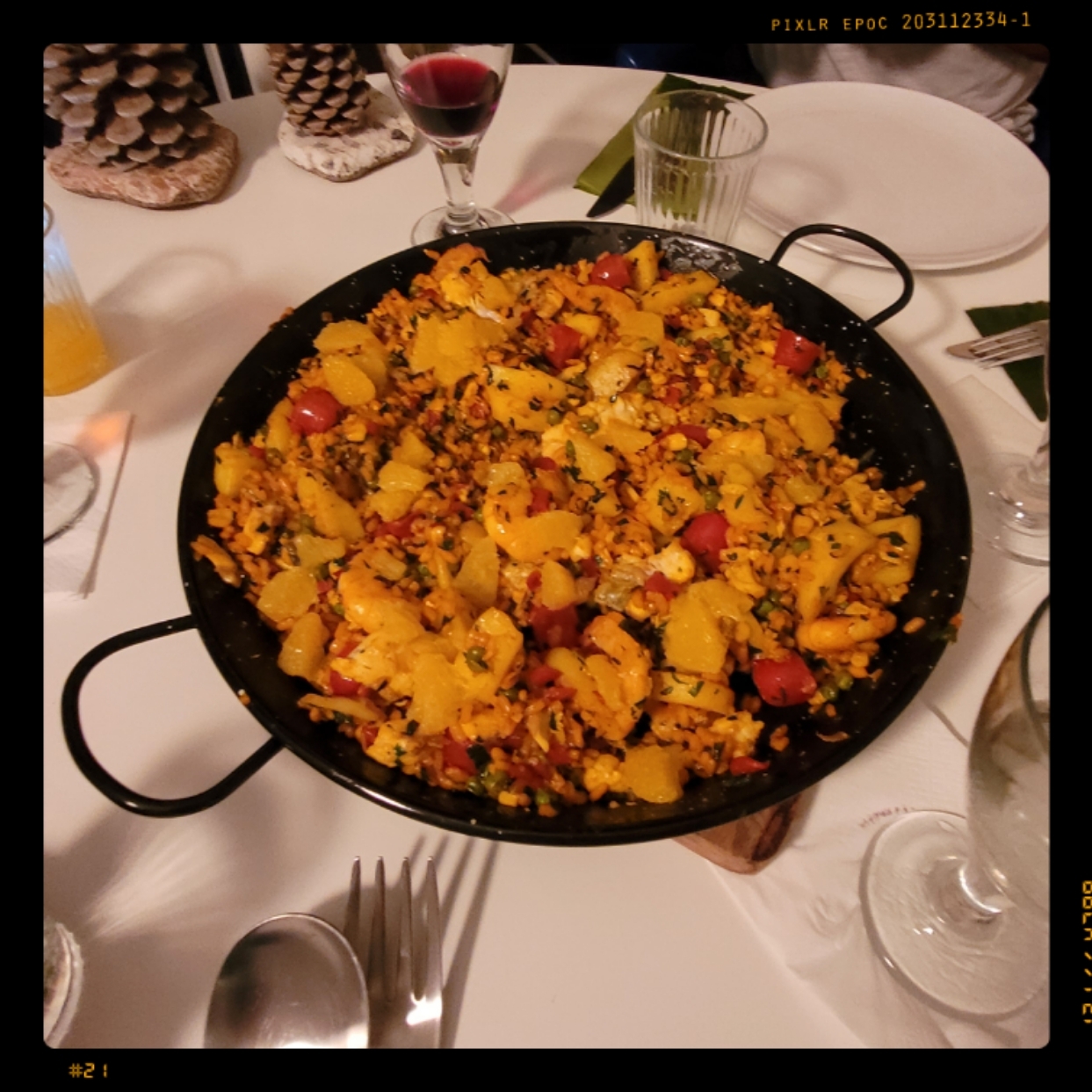 alles ca. 3 Min. in der Paella-Pfanne köcheln lassen, zum Schluss die Tomaten untermischen und noch kurz erwärmen, die Paella mit