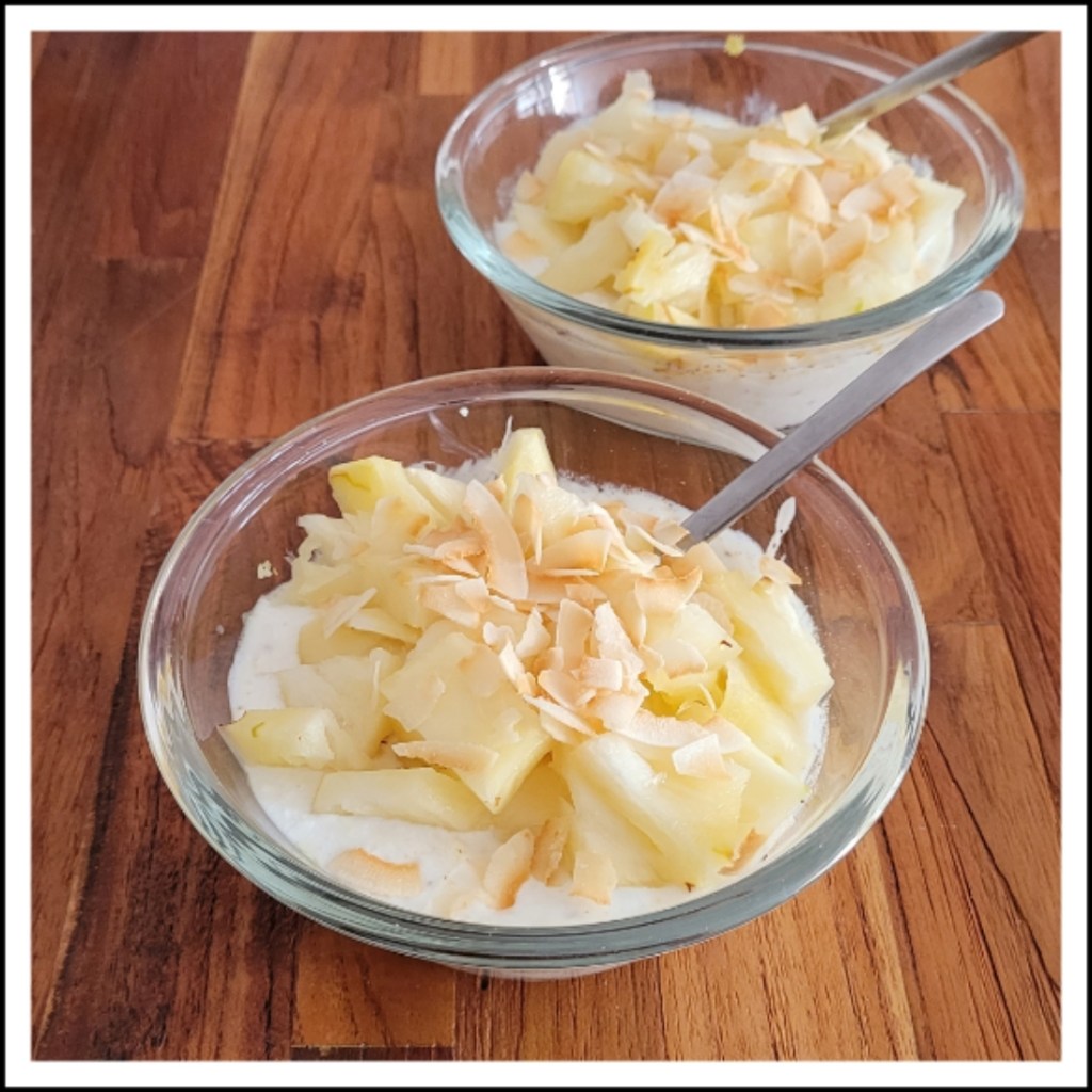ca. 200 g Ananas (1 dicke Scheibe – noch mit Schale gewogen) in kleine Stücke schneiden, auf die Joghurtmischung geben und mit
