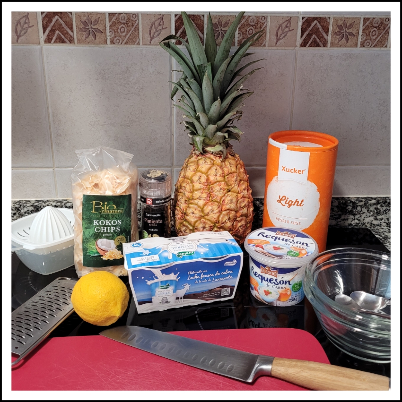 ca. 200 g Ananas (1 dicke Scheibe – noch mit Schale gewogen) in kleine Stücke schneiden, auf die Joghurtmischung geben und mit