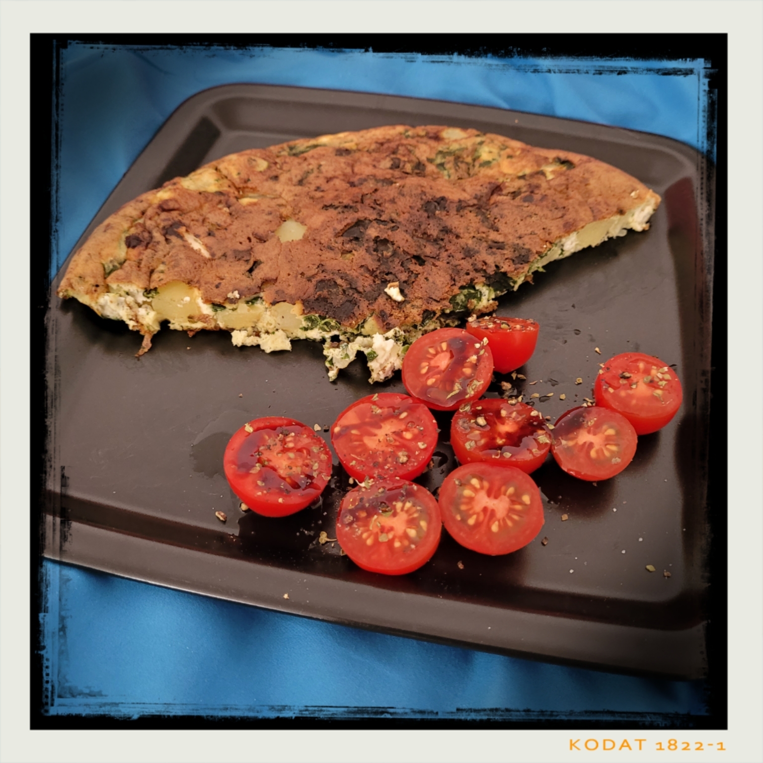 die Tortilla in zwei oder drei Stücke teilen und z. B. mit ein paar Tomaten, mit Salz und frisch gemahlenem Pfeffer gewürzt, servieren