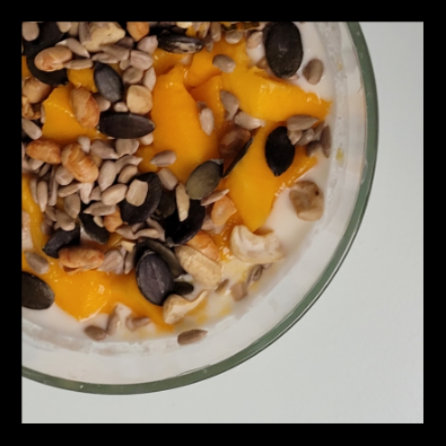 1/3 gr. Mango in kleine Stücke schneiden und teils untermischen, dann alles mit