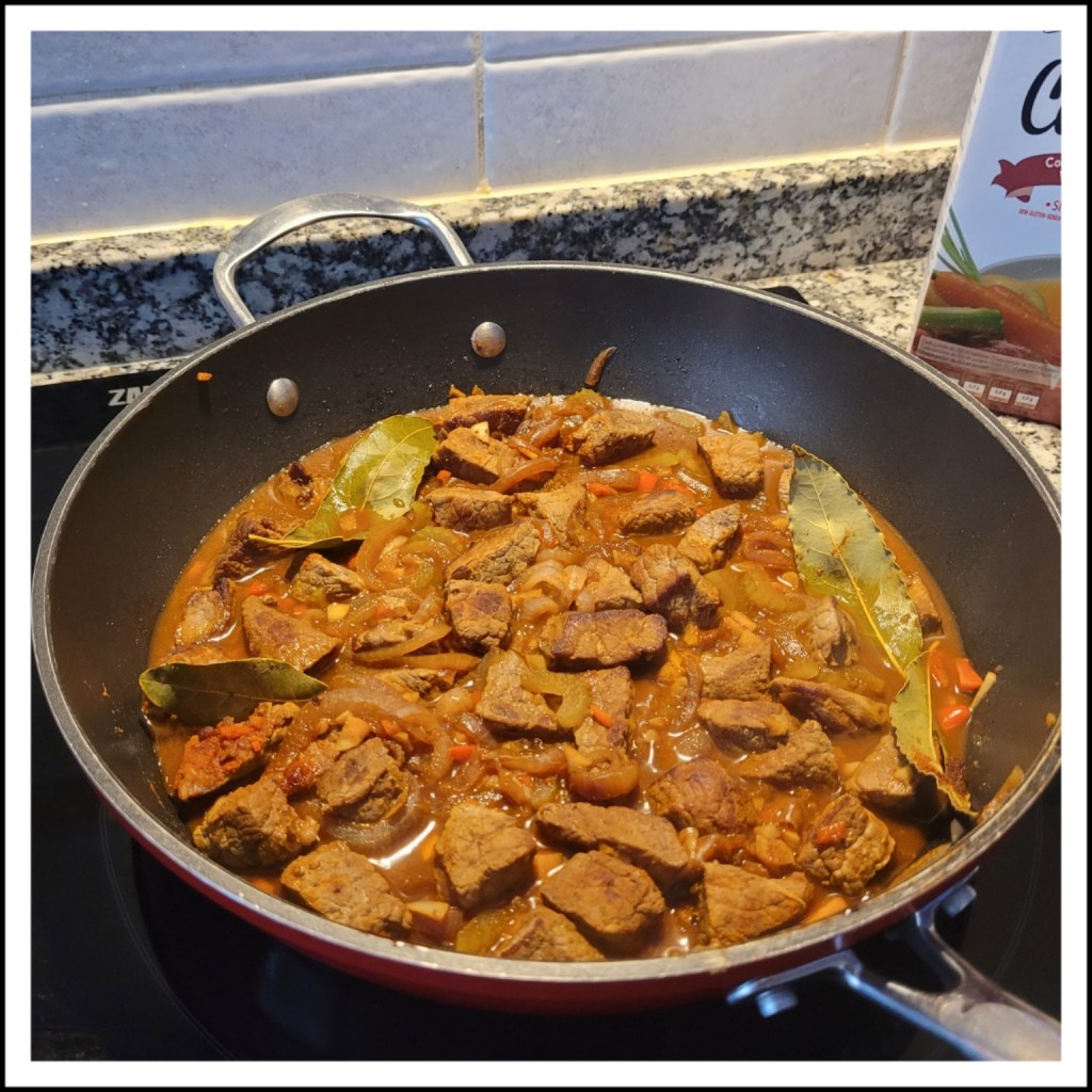 500 g Rindfleisch in Stücke von ca. 2 – 3 cm schneiden und in einer hohen Deckel-Pfanne (noch ohne Deckel) in