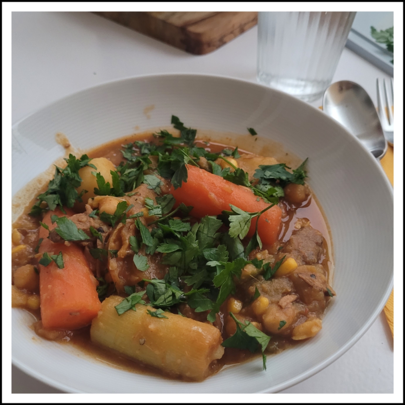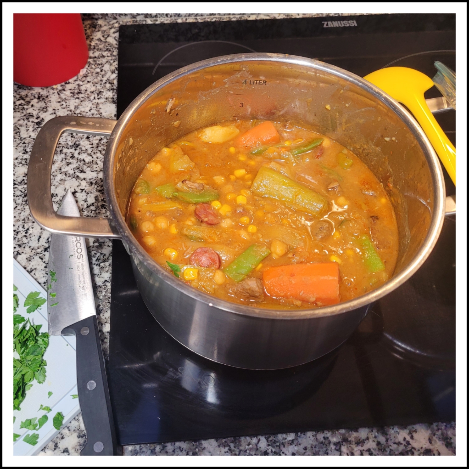 4 Lorbeerblätter hinzufügen, dann unter dem Deckel bei mittlerer bis mittelschwacher Hitze 20 Min. köcheln lassen – nicht wundern, die Batate wird zerkochen, das ist beabsichtigt und verleiht der Suppe eine festere/sämige Konsistenz – die Möhren und den Lauch hinzugeben und weitere 10 Min. kochen, nun Gemüsemais, Kichererbsen und Chorizo-Scheiben hinzugeben und weitere 5 Min kochen, zum Schluss die Zucchinischeiben unterrühren und noch einmal 5 Min. kochen,