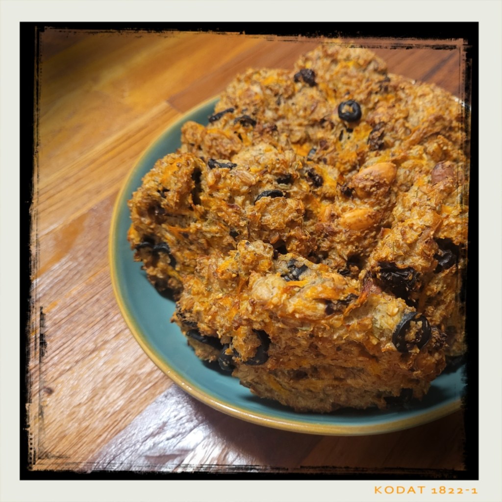 250 g Magerquark verrühren, anschließend die gequollenen Roggenflocken,