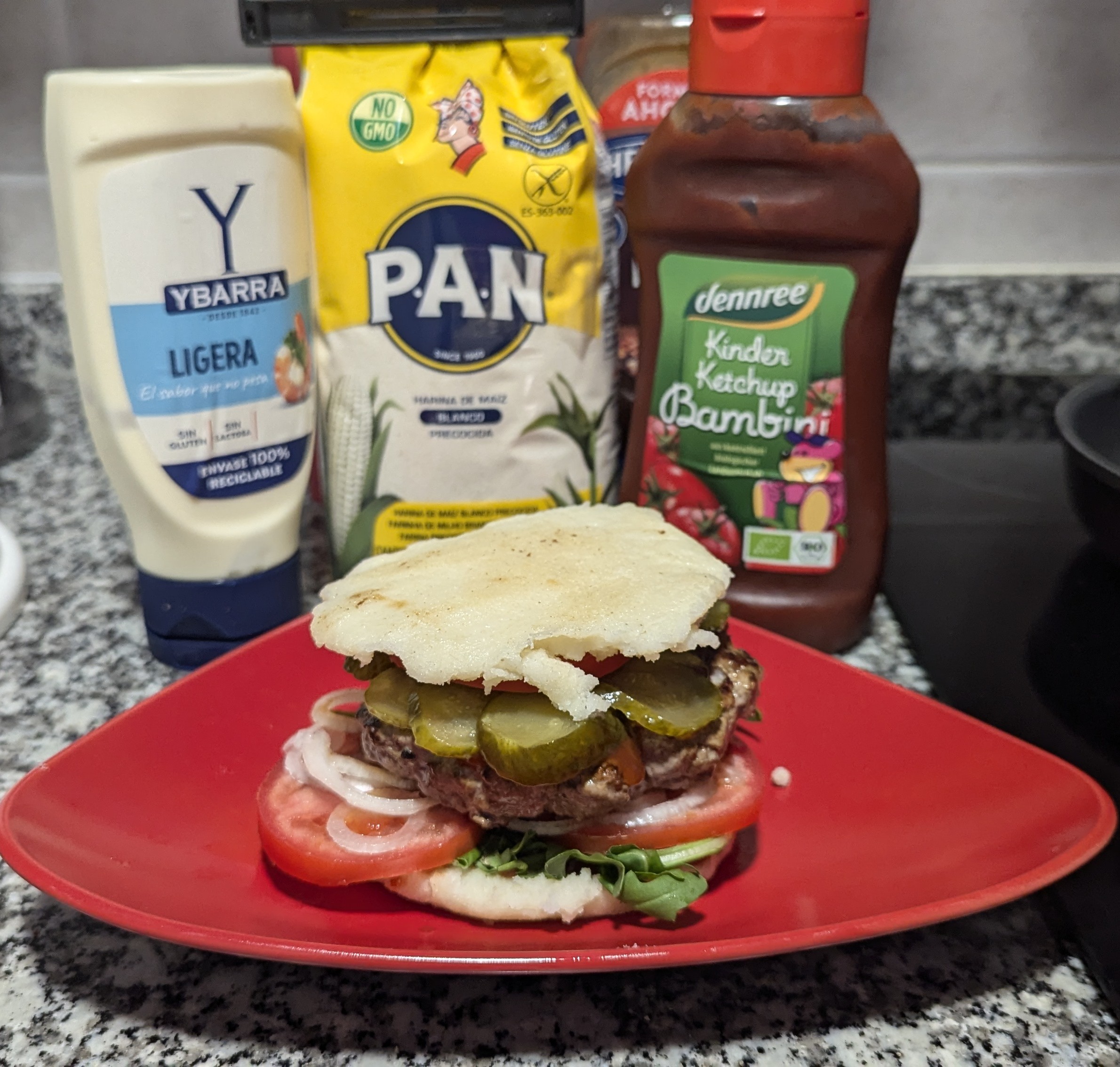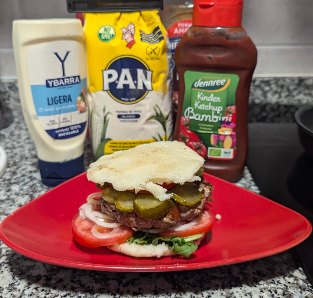 etwas BBQ-Soße darüber geben und mit dem Oberteil des Arepas bedecken