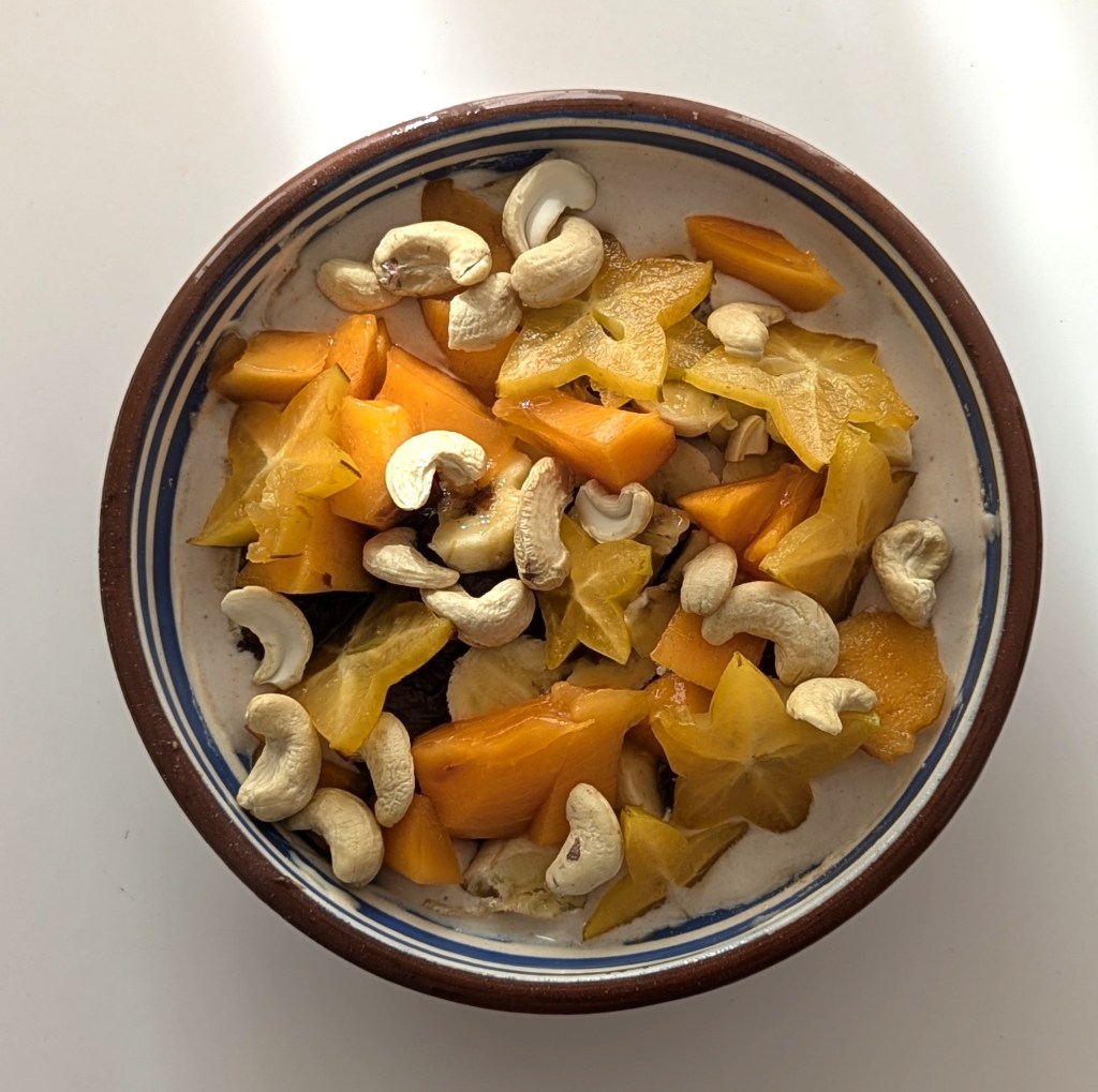 1 kleine Karambole (Sternfrucht) in Scheiben schneiden (dabei die Kerne entfernen) und