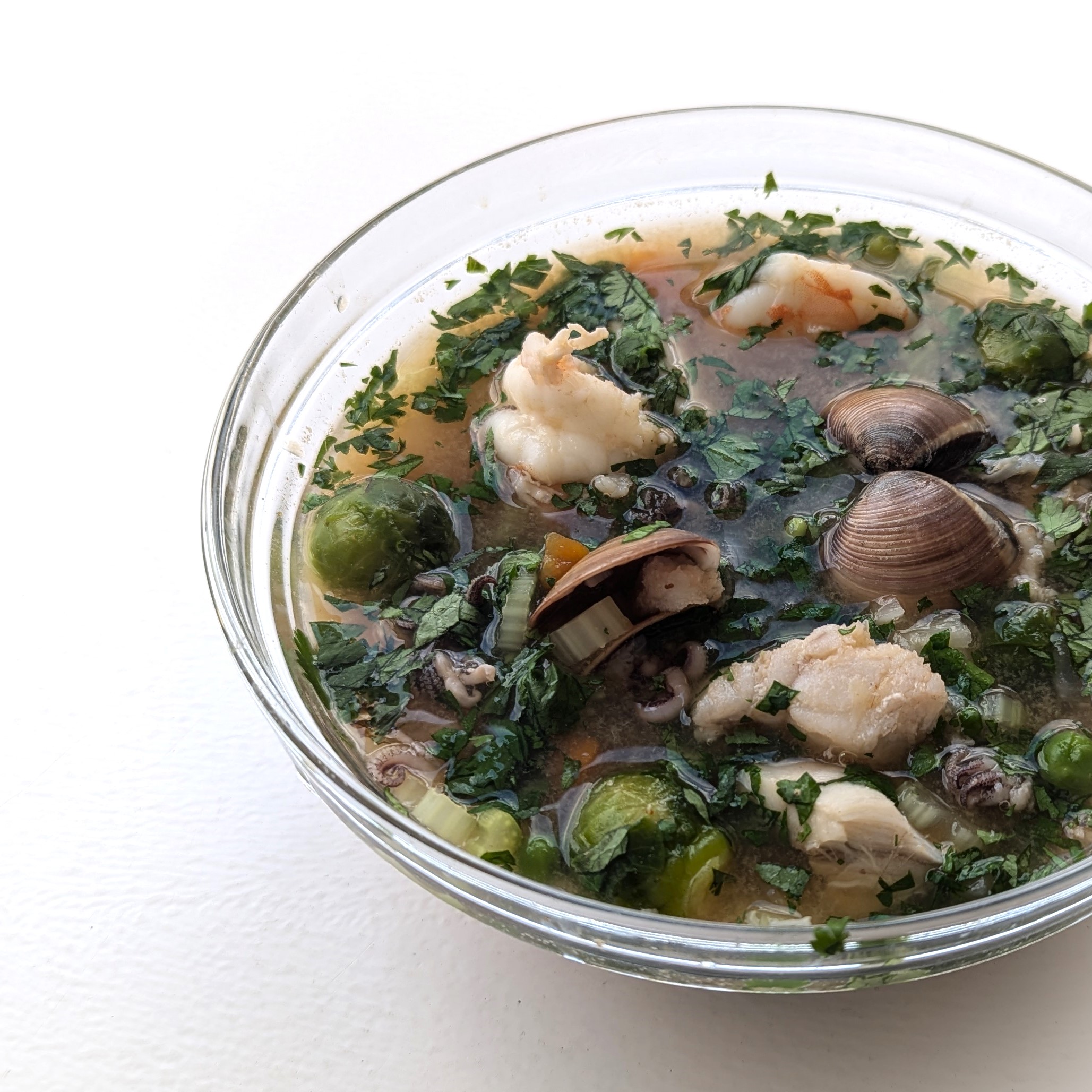 die Langostinos schälen und entdarmen, das Fischfilet von möglichen Gräten befreien und in größere Würfel schneiden, nicht geöffnete Muscheln wegwerfen,