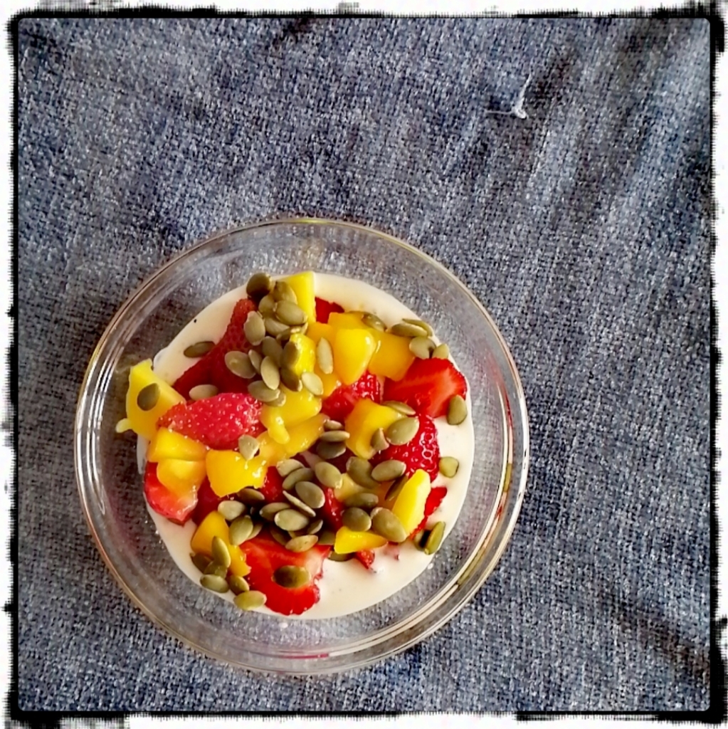 Vanillejoghurt mit Erdbeeren, Mango und Kürbiskernen